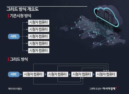'그리드 기술'은 스트리밍에 참여하는 시청자 컴퓨터를 이용해 서버에 몰리는 부하를 분산하는 게 핵심이다. 그리드의 사전적 의미는 '격자', '격자무늬'다. 얽히고설킨 격자처럼 '병렬식' 전송하는 것을 뜻한다. 스트리밍 서비스에 참여한 시청자가 단순히 영상을 보는 것에 그치지 않고 스트리밍 업체가 영상 전송에 다른 시청자들의 컴퓨터를 가상 서버로 만들고 역할을 나눠 다른 시청자에게 전달하는 방식이다. A시청자가 특정 영상을 스트리밍하게 되면 그 영상이 해당 시청자의 컴퓨터에 임시로 저장되고 새로운 B시청자가 동일한 영상을 스트리밍하면 A시청자의 컴퓨터가 가상의 서버가 돼 B시청자 컴퓨터에 전송하는 구조다.