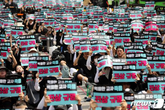지난해 서울 여의도 국회 앞에서 열린 '무법지대에서 교육안전지대로' 국회 입법 촉구 추모 집회에 참가한 전국 교사들이 교사의 억울한 죽음 진상 규명, 아동학대관련법 9월4일까지 개정, 실효적인 민원처리 시스템 마련 등을 촉구하고 있다. 2023.8.19/뉴스1 ⓒ News1 이승배 기자 |