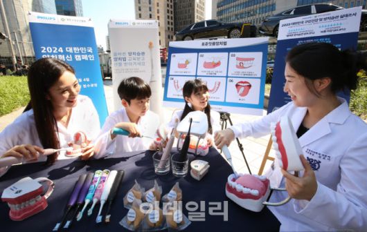 [이데일리 노진환 기자] 필립스 소닉케어가 '구강보건의 날(6월9일)'을 앞두고 4일 서울 명동 한국은행 앞 분수광장에서 대한구강보건협회와 함께 '2024 대한민국 양치혁신' 캠페인의 일환으로 양치교육 행사를 열고 있다. 대한구강보건협회 박용덕 회장(오른쪽 두 번째)이 시민들을 대상으로 구강 모형과 음파전동칫솔을 활용해 잇몸병 예방에 효과적인 ‘표준잇몸양치법’을 교육하고 있다. (사진=필립스코리아)