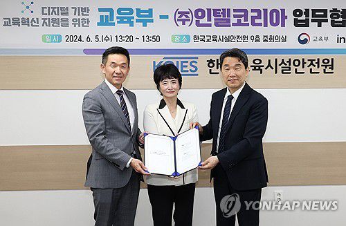 (서울=연합뉴스) 이주호 사회부총리 겸 교육부 장관(오른쪽)이 5일 서울 영등포구 한국교육시설안전원에서 권명숙 인텔코리아 대표이사(가운데), 한스 촹 인텔 아시아 태평양 지역 총괄과 디지털 기반 교육혁신 지원을 위한 업무협약을 체결 후 기념 촬영하고 있다. 2024.6.5 [교육부 제공. 재판매 및 DB 금지]