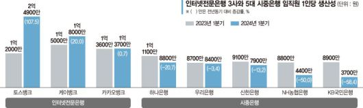 인터넷전문은행 3사의 직원 1인당 생산성 평균액이 1년 만에 39.4% 급증한 것으로 조사됐다. 같은 기간 5대 시중은행의 평균 생산성은 28.8% 줄었다. 특히 올해 1·4분기 홍콩항센중국기업지수(H지수) 주가연계증권(ELS) 자율배상 지급에 따라 일회성비용이 커지면서 KB국민은행과 NH농협은행 생산성은 절반 가까이 곤두박질쳤다. 반면 인터넷은행은 'H지수 ELS 사태'를 비껴간 데다 무점포 영업으로 경영효율성을 끌어올리면서 1인당 생산성이 높아진 것으로 분석된다.