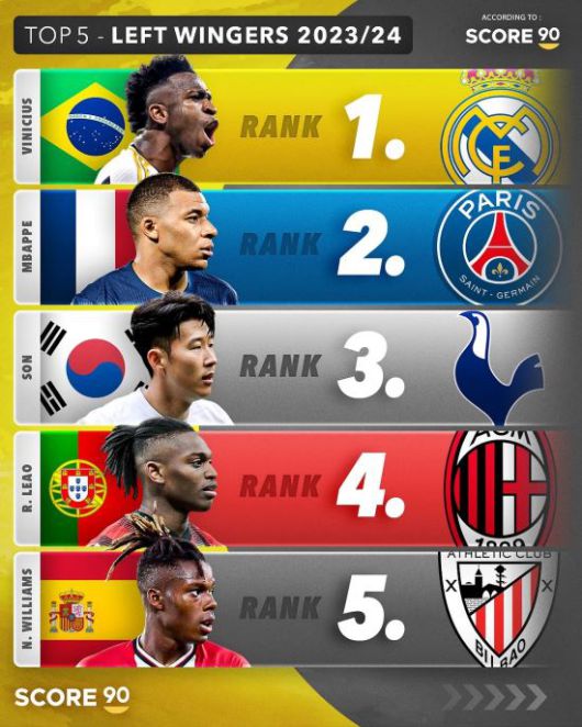 왼쪽 윙어 포지션이 눈길을 끌었다. 이번 시즌 레알 마드리드의 UEFA(유럽축구연맹) 챔피언스리그 우승을 이끈 비니시우스 주니오르가 1위에 올랐고 이번 시즌 PSG의 공격을 책임지고 레알로 이적한 킬리안 음바페가 2위였다. 손흥민은 두 선수에 이어 3위를 차지했다.