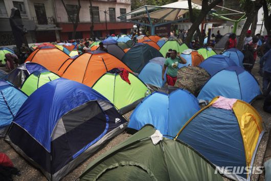[멕시코시티=AP/뉴시스] 멕시코시티의 중심가인 후아레스 지역의 조르다노 브루노 광장을 차지하고 있는 아이티 이민들의 임시 천막촌의 올 해 5월 18일 사진. 멕시코 이민국은 시내 최대의 텐트 밀집지역인 이곳을 완전히 철거했다고 6월 6일 발표했다. 2024. 06. 07. |