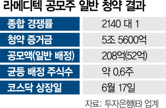 7일 투자은행(IB) 업계에 따르면 라메디텍이 전날부터 일반 투자자 배정 물량 32만 4500주(약 52억 원)에 대해 이틀간 일반 청약을 진행한 결과 최종 경쟁률이 약 2140대1로 집계됐다. 주문액의 절반을 미리 납부하는 청약 증거금은 약 5조 5600억 원, 청약 건수는 약 28만 건이었다. 대신증권(003540)이 상장 주관사를 맡았다.