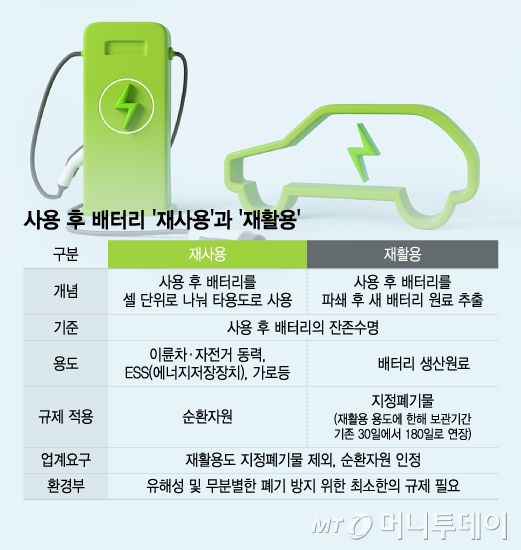 사용 후 배터리 '재사용'과 '재활용'/그래픽=윤선정 |
