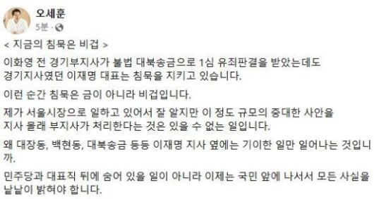 오세훈 서울시장은 8일 "이화영 전 경기부지사가 불법 대북송금으로 1심 유죄판결을 받았는데도 경기지사였던 (더불어민주당) 이재명 대표는 침묵을 지키고 있다"면서 "이런 순간 침묵은 금이 아니라 비겁"이라고 비판했다.