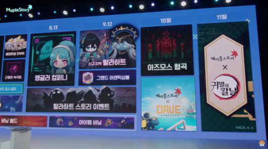 11월에는 애니메이션 '귀멸의 칼날'과의 컬래버를 진행한다. '메이플스토리'에서 새롭게 재해석한 '귀멸의 칼날'을 즐길 수 있도록 다양한 콘텐츠와 이벤트, 그리고 치장 아이템 등을 준비하고 있다.
