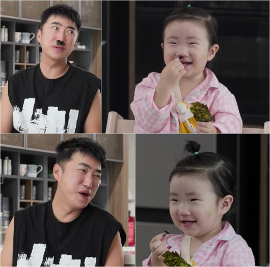 이 가운데 장동민과 지우가 ‘개그콘서트’의 코너를 그대로 옮겨놓은 듯 막강한 부녀 개그감을 뽐낸다. 아침을 먹던 지우가 “아빠 분장~”이라며 자신의 인중에 김을 붙이고 ‘베이비 찰리 채플린’으로 깜짝 변신한 것. 평소 다채로운 분장쇼로 시청자에게 새로운 재미를 선사했던 장동민의 개그 DNA를 물려받은 듯한 딸의 분장 놀이에 아빠 장동민이 웃음을 터트린다고. 이후 장동민도 자신의 인중에 김을 붙이고 ‘찰리 채플린’ 붕어빵 부녀를 완성시켜 폭소를 자아냈다는 후문.
