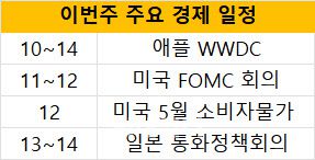 이번 주에는 FOMC 회의 외에도 애플의 연례 세계 개발자회의(WWDC) 역시 주식시장에 영향을 미칠 수 있는 이벤트로 꼽힌다. 애플은 10일 개막하는 WWDC에서 인공지능(AI) 전략을 발표할 예정이다. 이재원 신한투자증권 연구원은 “현재 마이크로소프트와 오픈AI가 챗GPT, 구글이 제미나이로 뒤쫓고 있는 생성형 AI 시장 구도에서 애플은 시장의 주목을 받지 못하고 있다”며 “WWDC에서 혁신적인 전략을 제시할 경우 애플 주가 상승과 함께 LG이노텍(011070), 비에이치(090460) 등 애플 관련 부품주에 긍정적 모멘텀이 부여될 수 있다”고 밝혔다.