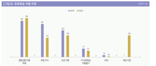 ‘화질이 우수하다’ ‘요금이 저렴하다’는 등의 이유로 유료방송을 사용했다고 응답한 비중은 17.5%, 19.8%였다. 2019년 각각 30.1%, 24.3% 였던 것을 감안하면 크게 떨어진 수치다.
