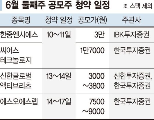 10~11일 일반청약을 실시하는 한중엔시에스와 씨어스테크놀로지는 수요예측에서 나란히 흥행에 성공했다. 기술특례상장으로, 희망 공모가 밴드 상단을 뛰어넘었다.