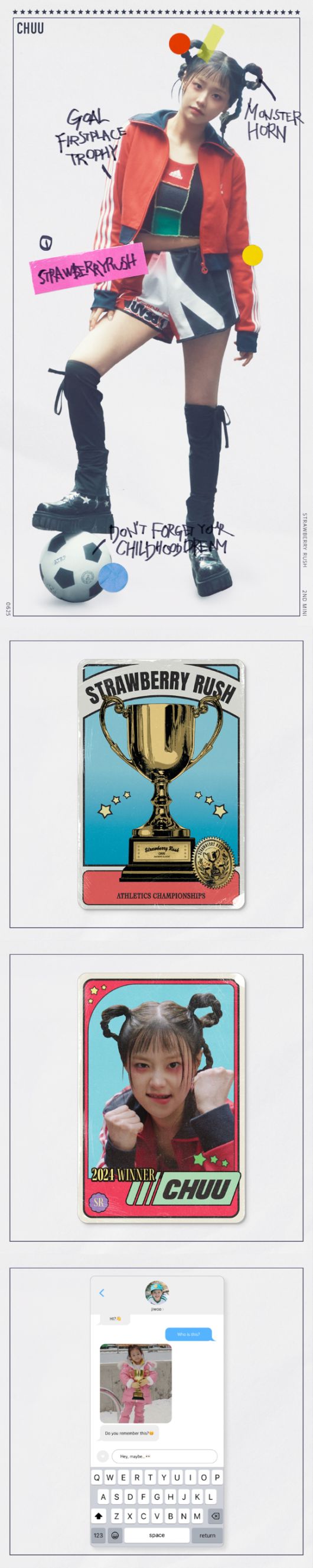 포토 카드에는 레트로한 감성의 트로피 이미지와 권투를 하듯 두 주먹을 불끈 쥔 포즈에 장난기 어리지만 비장한 각오가 전해지는 츄의 얼굴이 클로즈업된 사진이 디자인되어 있다. 특히 함께 공개된 트로피를 두 손으로 쥐고 있는 어린 여자 아이의 모습이 담긴 의문의 인스타그램 DM 화면은 앞서 공개된 메인 터저 속 키워드와 연장선을 이루며 'Strawberry Rush'를 통해 펼쳐질 음악 세계와 그 안에 담긴 서사는 무엇일지 관심이 집중된다.
