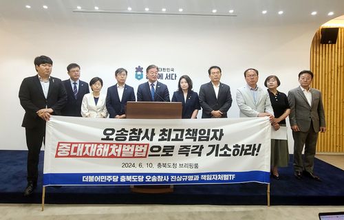 (청주=연합뉴스) 전창해 기자 = 더불어민주당 충북도당의 '오송참사 진상규명과 책임자처벌 TF'는 10일 "검찰은 오송참사의 최고책임자인 김영환 충북지사와 이범석 청주시장을 중대재해처벌법 위반 혐의로 조속히 기소하라"고 촉구했다.