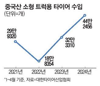 10일 대한타이어산업협회에 따르면 올해 1~4월 중국에서 수입한 소형 트럭용 타이어(LTR)는 약 44만2000개로, 수입산 LTR 중 93.3%를 차지한 것으로 집계됐다. 이 기간에 한국에서 유통된 국산·수입산 LTR이 약 168만8000개인 점을 고려하면 국내 LTR 시장 전체에서 중국산 제품 점유율은 26.2%에 이른다. 연도별 1~4월 기준으로 국내 LTR 시장에서 중국산 점유율은 2022년 12.8%, 지난해 19.1% 등 커지고 있다.