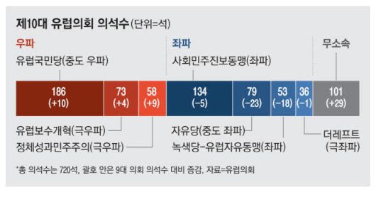 제10대 유럽의회 선거에서 우르줄라 폰데어라이엔 유럽연합(EU) 집행위원장(65)이 이끄는 중도 우파인 유럽국민당(EPP)이 제1당을 사수하는 데 성공했다. 폰데어라이엔 위원장은 중도파, 녹생당 등과 연정을 구성해 연임에 성공할 가능성이 높아졌다. 다만 경제위기와 이민정책에 대한 불만 등으로 극우파가 약진해 EU 정책이 보수화될 것이라는 예상이 나온다.