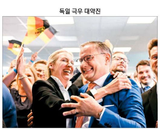 9일(현지시간) 독일에서 치러진 유럽의회 선거에서 2위를 차지한 극우 정당 '독일을 위한 대안'의 알리스 바이델 부대표(왼쪽)와 티노 크루팔라 공동대표가 환호하고 있다. EPA연합뉴스 |