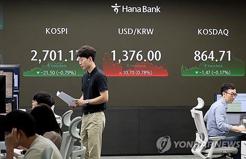 코스피는 전장 대비 0.79% 내린 2,701.17에 장을 마쳤으며 코스닥지수는 0.17% 하락해 864.71을 나타냈다.