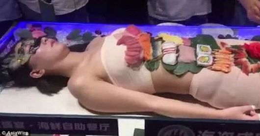 매체에 따르면 영상 속에는 벌거벗은 여성이 테이블 위에 누워 있는 모습이 나온다. 여성의 몸은 그림과 꽃으로 장식돼 있고 그 위에 생선회와 초밥 등 음식이 올려져 있다. 준비 시간은 1~2시간 정도였고 여성은 손님들의 식사가 끝날 때까지 움직이지 않고 누워 있어야 했다.