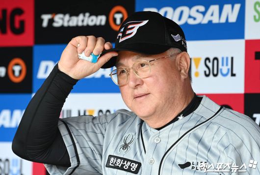 (엑스포츠뉴스 잠실, 박지영 기자) 11일 오후 서울 송파구 잠실야구장에서 열리는 '2024 신한 SOL Bank KBO리그' 한화 이글스와 두산 베어스의 경기에 앞서 한화 김경문 감독이 더그아웃에서 취재진과 이야기를 나누고 있다.박지영 기자 jypark@xportsnews.com