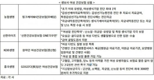 신한라이프 이전 농협생명도 여성특화보험 '핑크케어NH건강보험(무배당)'을 올해 초 출시했다. 이 상품은 여성 주요암 초기이외 유방암, 여성생식기암 진단 시 각각 최대 1억원까지 보장해준다. 여성에게 자주 발생하는 질환을 보장할 수 있는 갑상선케어특약 등 특약도 담았다.