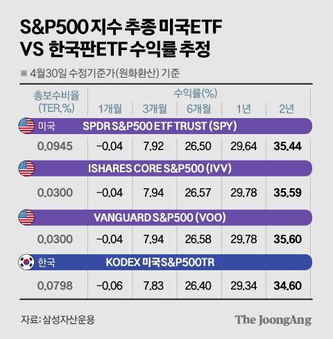 보수는 종목에 따라 천차만별이지만, 국내 ETF보다 규모가 훨씬 큰 미국 ETF의 보수가 싼 경우가 많다. S&P500을 추종하는 미국의 대표적 ETF인 SPY·IVV·VOO의 수익률과 ‘한국판 SPY’ 중 가장 보수가 저렴한 ‘KODEX 미국S&P500TR’ 수익률을 시뮬레이션해 봤다. 배당은 모두 재투자한다고 가정할 때 단기간에는 수익률 차이가 크지 않았지만, 2년간 수익률은 보수가 낮은 IVV와 VOO가 KODEX 상품보다 1%포인트가량 높아졌다.