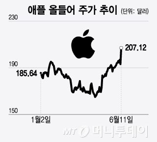애플 주가는 11일(현지시간) 7.3% 급등한 207.15달러로 마감하며 사상최고치를 경신했다. 이 같은 하루 상승률은 2022년 이후 처음이며 애플 주가가 하루에 7% 이상 오르기는 지난 3년 동안 이번이 3번째다.