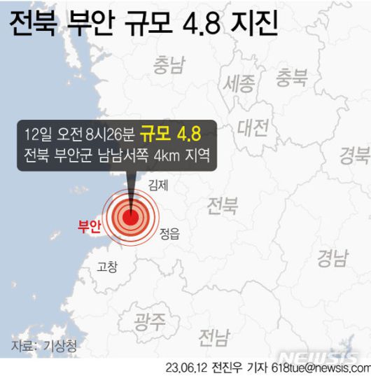 앞서 기상청은 이날 오전 8시26분께 전북 부안군 남남서쪽 4㎞ 지역에서 규모 4.8 지진이 발생했다고 밝혔다. 이번 지진은 올해 한반도와 주변 해역에서 발생한 지진 중 가장 큰 규모다. 진원의 깊이는 8㎞로 추정됐다.