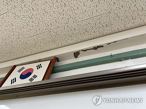 지진으로 천장에 금이 간 교실 |