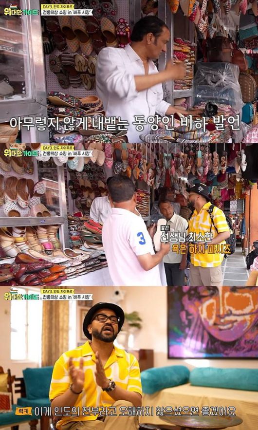 지난 10일 방송된 MBC에브리원 예능 프로그램 '위대한 가이드'에서는 인도 출신 방송인 럭키와 함께 인도로 떠난 신현준, 박명수, 오마이걸 미미, 채코제 등의 모습이 그려졌다.