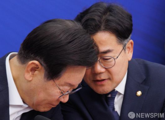 [서울=뉴스핌] 윤창빈 기자 = 이재명 더불어민주당 대표, 박찬대 원내대표가 12일 오전 서울 여의도 국회에서 열린 최고위원회의에서 귀엣말을 나누고 있다. 2024.06.12 pangbin@newspim.com |