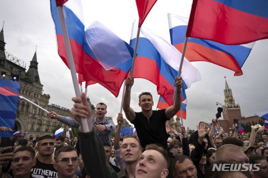[모스크바=AP/뉴시스] 11일(현지시각) 러시아 모스크바의 붉은광장에서 러시아의 날 기념 콘서트가 열려 관람객들이 러시아 국기를 흔들고 있다. 러시아는 1991년 6월 12일 소련이 무너지고 러시아 연방이 설립된 것을 '러시아의 날'로 기념하고 있다. 2024.06.12.