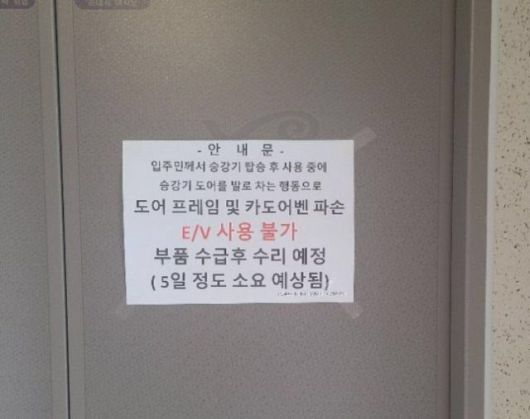 [이데일리 홍수현 기자] 인천의 한 아파트 승강기를 발로 차 고장 낸 입주민이 사과의 뜻을 전하면서도 수리비를 내지 않아 입주민들의 원성을 사고 있다.
