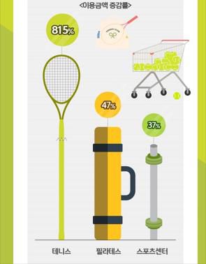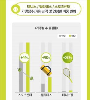 분석 결과에 따르면 건강관리를 위해 운동이 필수인 시대가 되면서 신한카드의 스포츠센터 가맹점수는 44%, 요가·필라테스는 90%, 테니스장은 213% 증가했다. 같은 기간 이용금액도 각각 37%, 47%, 815% 급증한 것으로 나타났다.