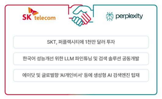 SKT는 국내서 서비스 중인 AI 개인비서 '에이닷(A.)'에 퍼플렉시티의 AI 검색엔진을 우선 적용해 에이닷에서 대화형 질문, 검색 결과 요약, 연관 검색어 제안, 영문번역 및 요약 등의 기능을 구현할 수 있을 것으로 기대했다. SKT 가입자를 대상으로 하반기 중 퍼플렉시티의 월 2만원대 유료 AI 검색 서비스를 1년 간 무료로 이용할 수 있는 혜택도 제공한다. 이외에도 퍼플렉시티는 향후 SKT의 미국 법인 '글로벌 AI 플랫폼 코퍼레이션(GAP Co.)'에도 투자하기로 SKT와 합의했다.