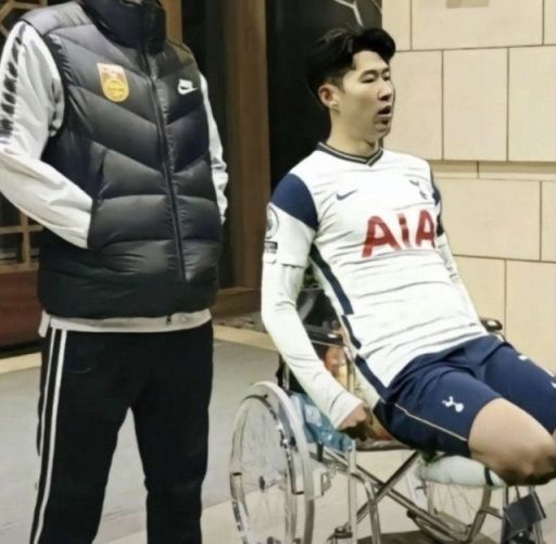 공개된 사진을 보면, 손흥민이 다쳐 휠체어에 앉아 매니저의 도움을 받고 있다. 다른 사진에서는 중국 선수가 휠체어에 앉아 있는 손흥민에게 과일 바구니를 주고 있다.