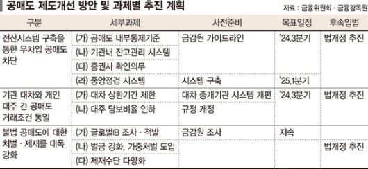금융당국은 공매도 전산시스템 등 무차입 공매도를 방지하기 위한 인프라 및 제도부터 마련한 뒤 공매도를 전면 재개한다는 목표다. 동시에 공매도 관련 개인 및 기관투자자 간의 규제차익을 줄이면서 그동안 개인투자자에게 불리했던 공매도 거래조건도 개선하기로 했다.