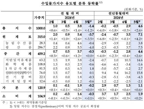 5월 수입물가지수도 전월보다 1.4% 낮은 141.58로 집계됐다. 역시 다섯 달 만의 하락세 전환이다.