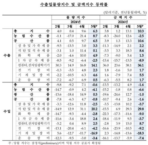 5월 무역지수의 경우 수출금액지수(136.58)와 수출물량지수(118.97)는 1년 전보다 각 10.3%, 6.3% 상승했다. 컴퓨터·전자 및 광학기기(36.1%)를 중심으로 공산품 수출 금액이 10.6% 늘었다.
