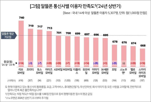 그 결과 알뜰폰 통신사 체감 만족도는 리브모바일이 740점으로 1위를 차지했다. 뒤이어 프리티가 719점, 토스모바일이 717점, 아이즈모바일 713점, A모바일 701점, M모바일 700점 순으로 집계됐다.
