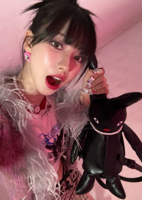 토끼 가방의 귀를 잡은 장난스러운 표정이 귀여움을 더하고 있으며, 앞머리와 묶은 머리로 곧 소멸할 것만 같은 작은 얼굴이 눈길을 끈다.