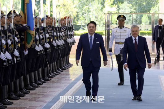 우즈벡 공식환영식 윤석열 대통령이 14일 오전(현지시간)타슈켄트 대통령궁 영빈관 앞 광장에서 열린 공식환영식에 샤브카트 미요지르예프 우즈베키스탄 대통령과 함께 의장대를 사열하고 있다. 2024.6.14 [우즈베키스탄 타슈켄트/이승환기자] [ⓒ 매일경제 & mk.co.kr, 무단 전재, 재배포 및 AI학습 이용 금지]