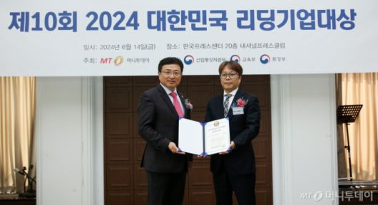 박지훈 제이피에너지 대표(사진 오른쪽)가 14일 오후 서울 중구 한국프레스센터에서 열린 머니투데이 주최의 '2024 제10회 대한민국 리딩기업대상' 시상식에서 '이차전지 소재 및 배터리 개발' 부문 'R&D혁신대상'을 수상한 뒤 이종섭 동국대학교 교수와 기념 촬영 중이다.