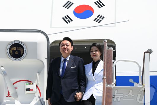 윤 대통령과 김건희 여사는 이날 오전 11시쯤 사마르칸트 공항에 도착했다. 남색 정장에 노타이 차림의 윤 대통령은 베이지색 원피스를 입은 김건희 여사와 함께 공군 1호기(대통령 전용기)에서 내렸다.
