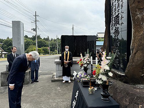 (서울=연합뉴스) 윤덕민 주일 한국대사가 15일(현지시간) 혼슈 동북부 미야기현 사찰에 있는 안중근 의사 현창비를 찾아 헌화하고 있다.