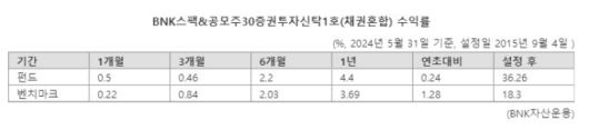 16일 BNK자산운용에 따르면 BNK스팩&공모주30증권투자신탁1호(채권혼합)의 1년 수익률은 4.4%(5월 말 기준)다. 벤치마크(BM)인 'KOBI120국공채 95%+KOSPI 5%'(3.69%)의 성과를 0.71%포인트 상회한다. 지난 2015년 9월 4일 설정 이후 수익률은 36.26%로 벤치마크 수익률(18.3%)보다 17.96%포인트 높다.