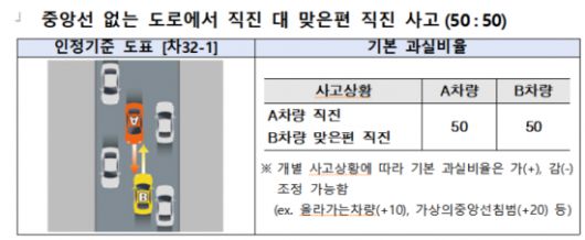 동일방향으로 주행하는 양 차량이 진로변경 중 발생한 사고에 대한 분쟁이 1·2순위(4만7000건·35.9%)로 가장 많았다. 신호등 없는 교차로, 중앙선 없는 도로에서의 사고로 인한 분쟁이 각각 3순위(약 8500건·6.5%), 4순위(약 6800건·5.2%)로 나타났다. 안전거리 미확보나 전방주시 의무 소홀 등으로 발생하는 전방 추돌 사고로 인한 분쟁은 5순위(약 4500건·3.5%)였다.