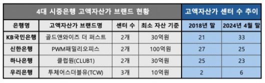 은행별로 보면 국민은행의 PB 센터는 지난 2018년 21개에서 올 4월 말 33개로 12개(57.1%) 증가했다. 같은 기간 우리은행은 PB 센터를 2곳에서 6곳으로 3배 늘렸다. 신한은행(27개→25개)과 하나은행(25개→23개)의 경우 각각 두 곳씩 감소했지만 대형화를 추진하는 과정에서 통폐합을 실시한 결과라는 설명이다.