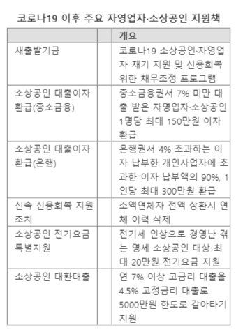 연명할 수 있는 자영업자에게는 보다 과감한 지원이 필요하다는 목소리도 나온다. 차남수 소상공인연합회 정책본부장은 "자영업자·소상공인 만기 연장 기간을 아예 길게 10년으로 늘리거나 청년희망통장처럼 소상공인희망통장을 만든다면 (소상공인들이) 목돈을 만들어 원리금 상환에 대한 부담을 낮출 수 있다"고 제안했다.