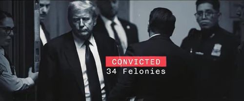 광고는 트럼프 전 대통령이 뉴욕 맨해튼 형사 법정에 걸어 들어가는 장면을 흑백 이미지로 보여주면서 그가 34개 중범죄로 유죄 평결을 받았으며, 성범죄와 금융사기에 대한 책임도 인정된다고 지적한다.