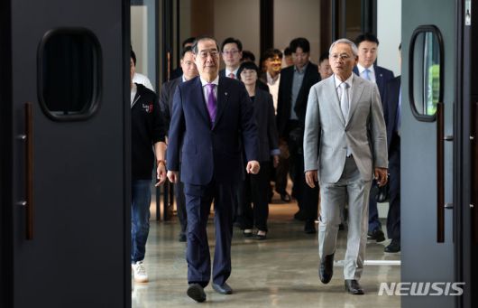 [성남=뉴시스] 홍효식 기자 = 한덕수 국무총리가 18일 오후 경기 성남시 분당구 네오위즈 내 게임 방송 영상 스튜디오를 방문하고 있다. 2024.06.18. yesphoto@newsis.com